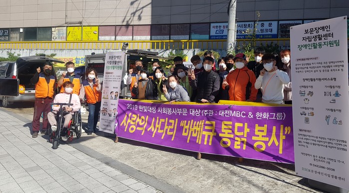 [대전=세계타임즈 이채봉 기자] 대전광역시 SNS 일만명 봉사단체 사랑의 사다리 밴드(리더 이정제)는 18일 오후1시~오후3시에 동구 판암동에 위치한 보문장애인자립생활센터(소장 신인수)에서 바비큐 통닭 50마리 봉사로 우리 사회의 따뜻한 사랑을 실천 하였다.
