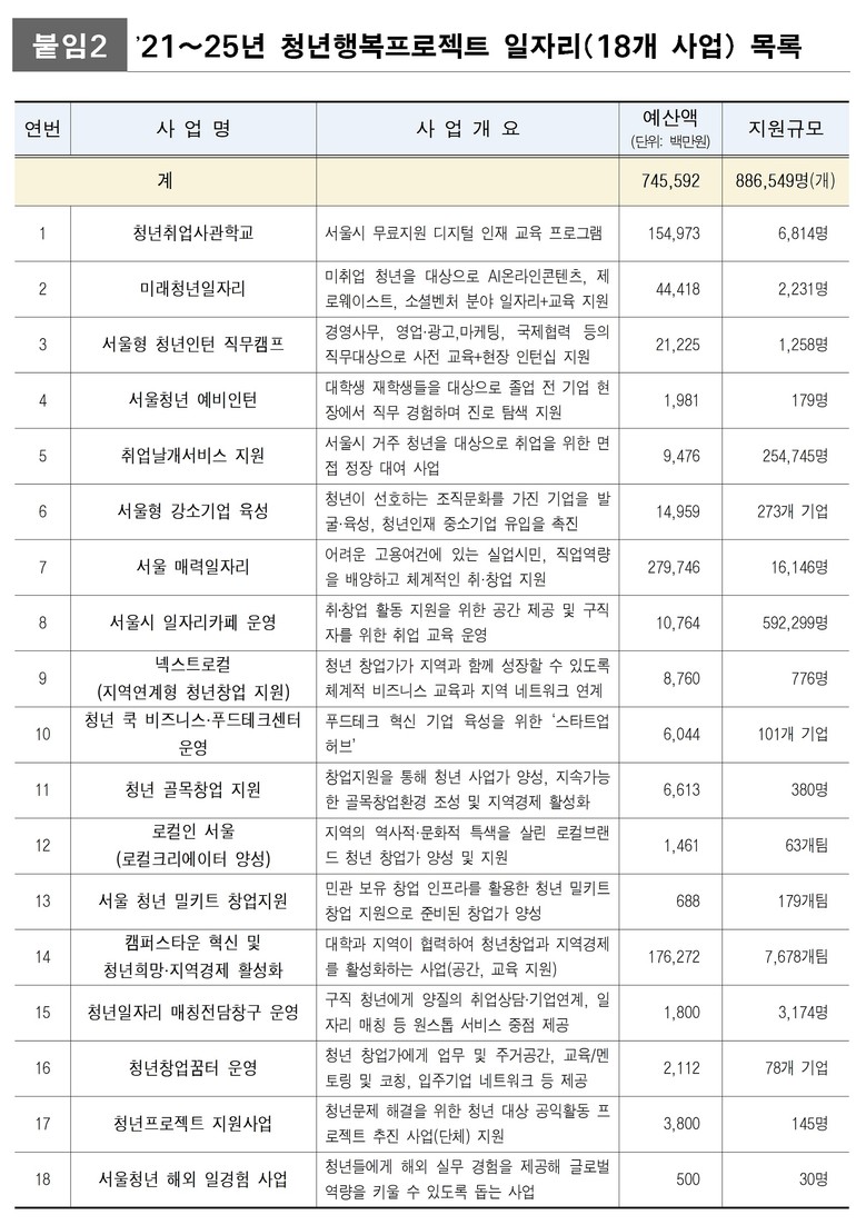 시는 청년 취업에 실질적으로 도움되는 ‘직무 경험’과 ‘맞춤형 역량 강화’를 중심으로 ▴청년취업사관학교 ▴청년인턴 직무캠프 ▴미래 청년 일자리 ▴서울청년 예비인턴 등 18개 사업에 총 7,455억 원을 투입해 왔다.