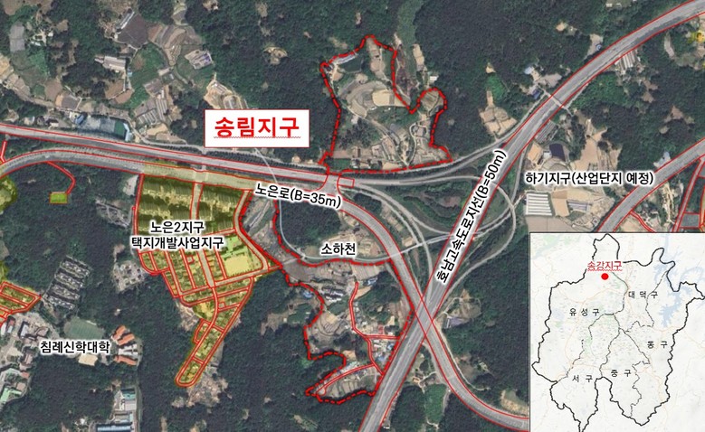 유성JC 일원 송림지구에는 인근 산업단지 조성 예정지인 하기지구와 안산 국방산업단지와의 연계성을 고려하여 국방‧우주‧항공 등 첨단산업 육성을 위한 산업단지로 구축한다.