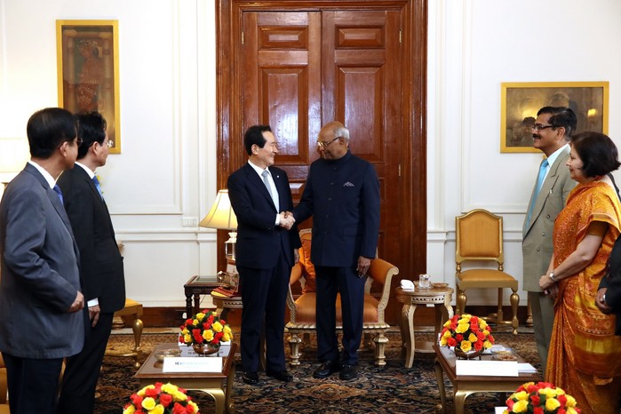 [세계타임즈 이채봉 기자]인도를 공식 방문 중인 정세균 국회의장이 람 나트 코빈드 (Ram Nath Kovind) 대통령을 면담했다. 정 의장은 현지시각 3월 8일 오전 12시 뉴델리에 위치한 대통령궁에서 코빈드 대통령과 만났다.