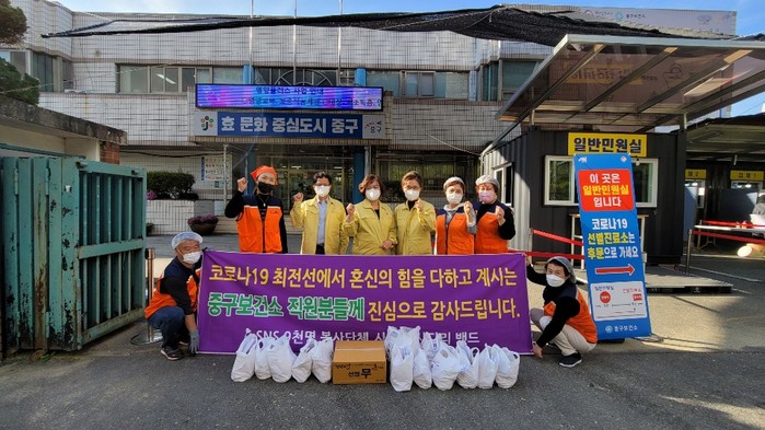 구기희 중구보건소장은 “오늘 사랑의 사다리 밴드 봉사단체에서 맛있는 통닭을 지원해 주어서 큰 힘과 위안이 된다.”면서 “중구보건소는 코로나19의 종식을 위해서 최선의 노력을 다하겠다.”고 말했다.