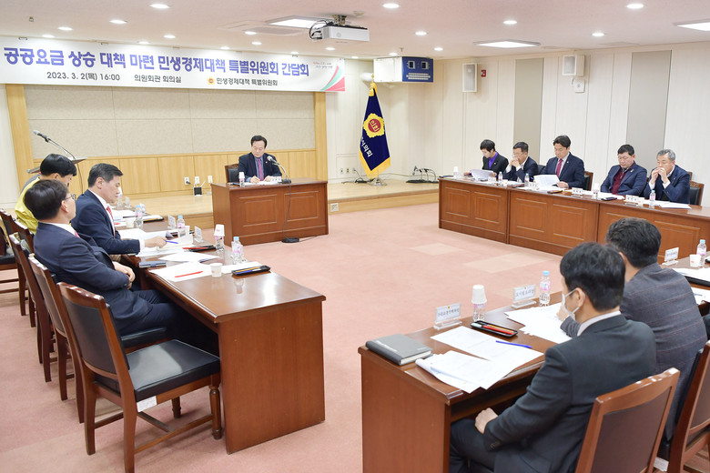 3월 2일(목) 시의회 의원회관 회의실에서 열린 간담회에는 윤태한 민생경제대책 특별위원회 위원장을 비롯하여, 강달수 부위원장, 김재운‧박종율‧박종철‧박진수‧박희용‧서지연‧양준모‧이승우 특별위원회 위원 및 부산시 공공요금 6종(도시철도, 버스, 택시, 도시가스, 상‧하수도)을 소관하는 부서장 7명이 참석하였다.