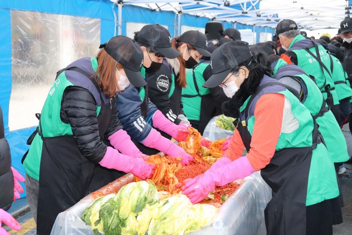 배추는 매년 해 왔듯이 한솥도시락에서 전량 기부로 추운 날씨에도 불구하고 김장훈 낭만 회원 봉사대, 마홍배 사랑& 희망 나눔 운동본부 총재 변애련 밀알 글로벌 다문화 총 연합회 중앙회 회장 압구정 주민 자원봉사단 압구정 로데오 상인들이 함께 했다