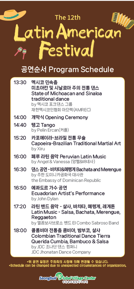 또한 아르헨티나 탱고, 멕시코 전통춤, 바차타, 살사 등 댄스 공연을 비롯해 라틴 밴드및 에콰도르 가수 공연 등이 펼쳐지며 지구 반대편 라틴아메리카 문화를 성북구에서 생생하게 경험할 수 있다.