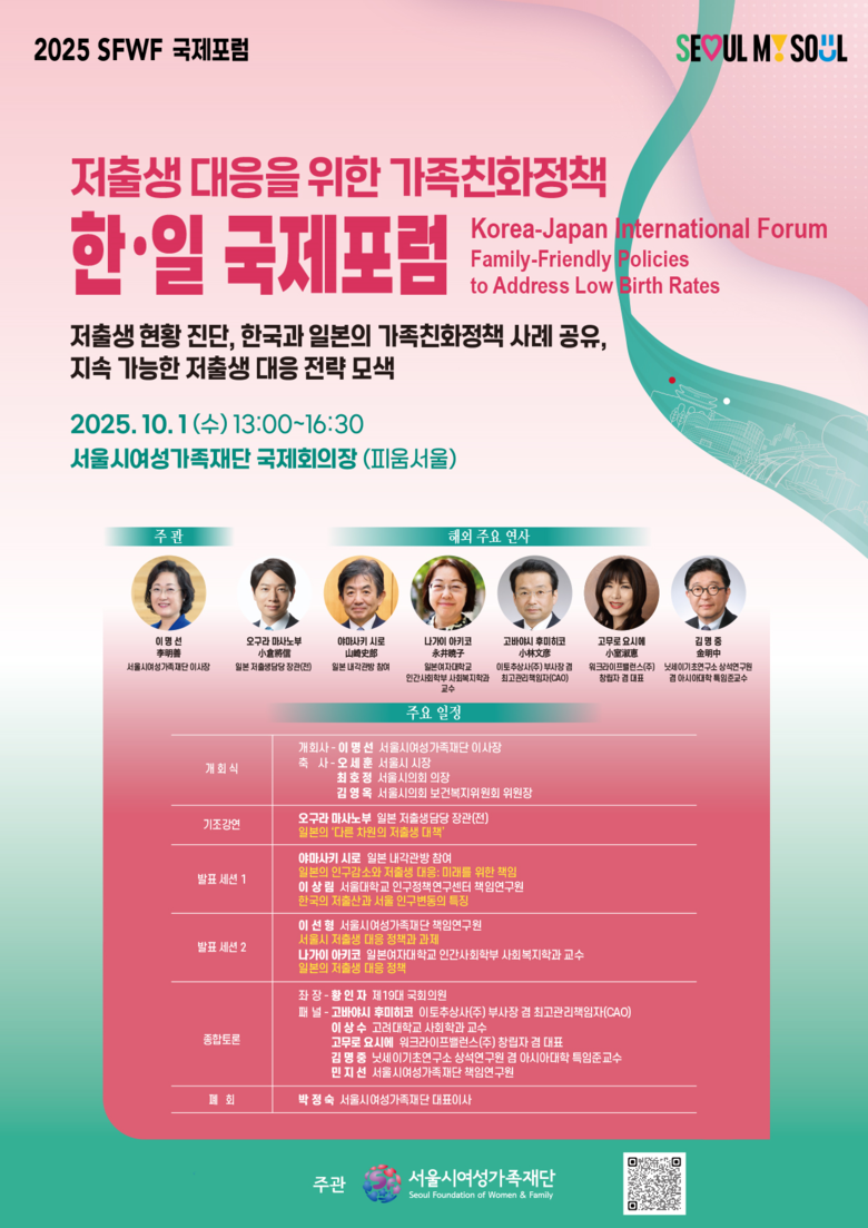 □ 포럼 개요 ○ 포럼명: 저출생 대응을 위한 가족친화정책 한·일 국제포럼 ○ 일시: 2025년 10월 1일(수) 13:00~16:30 ○ 장소: 서울여성플라자 국제회의장 피움서울 ○ 주최: 서울시여성가족재단 ○ 대상: 서울시 및 투자·출연기관 관계자, 학계·전문가, 시민 등 100여 명 ○ 언어: 한국어·일본어 동시통역 제공 |