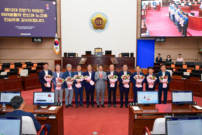 [경남 세계타임즈=최성룡 기자] 경상남도의회가 7월 11일 본회의장에서 제12대 전반기 확대의장단에 공로패 및 꽃다발 수여식을 열었다.