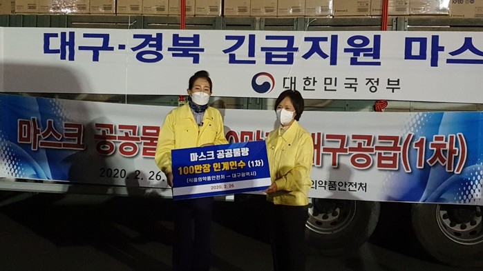 배지숙 의장은 ‘코로나19’ 비상대책으로 바쁜 대구시 관계자를 대신해 이날 식약처로 부터 공급된 마스크를 수령했다. 배지숙 의장은 전달식에 참석해 준 이의경 식품의약품안전처장에게 감사의 뜻을 전하고, 대구에 감염병 확산을 방지하기 위해서 늦어도 다음 주 초까지는 마스크 500만장을 집중 공급해 줄 것을 요청했다.