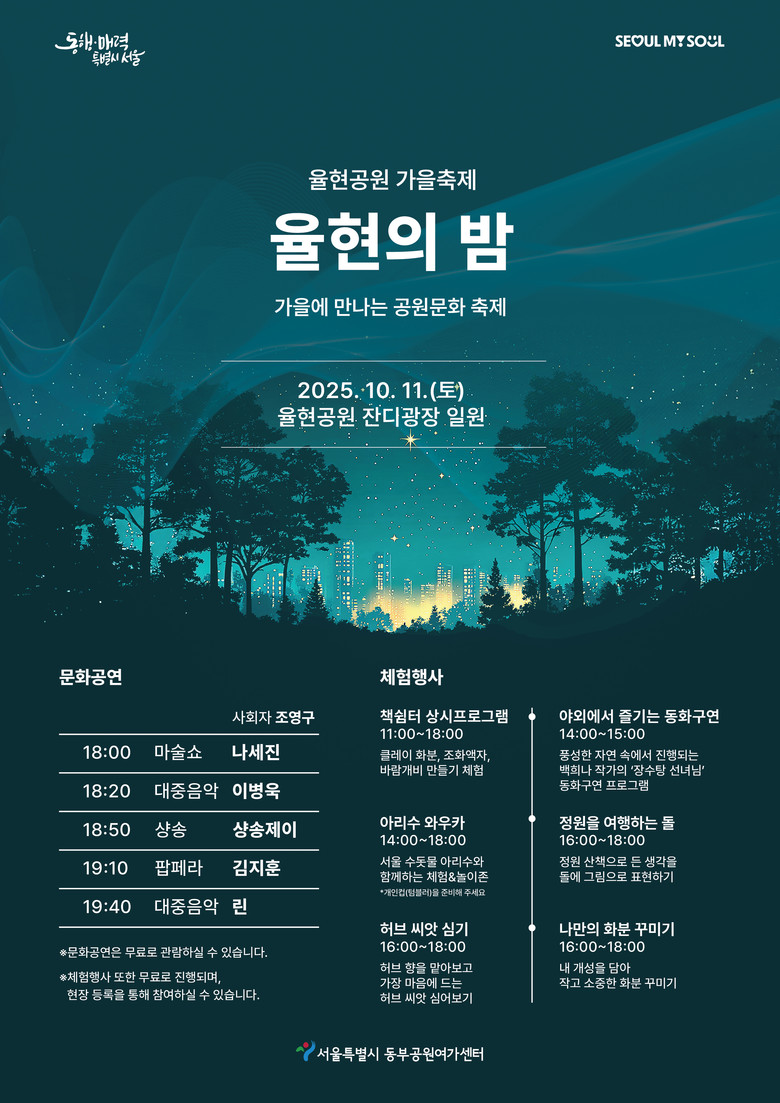 박미성 동부공원여가센터소장은 “율현공원 가을축제에서 준비한 다양한 공연과 프로그램을 즐기며 문화가 흐르는 율현의 밤을 함께하길 바란다.”고 말했다.