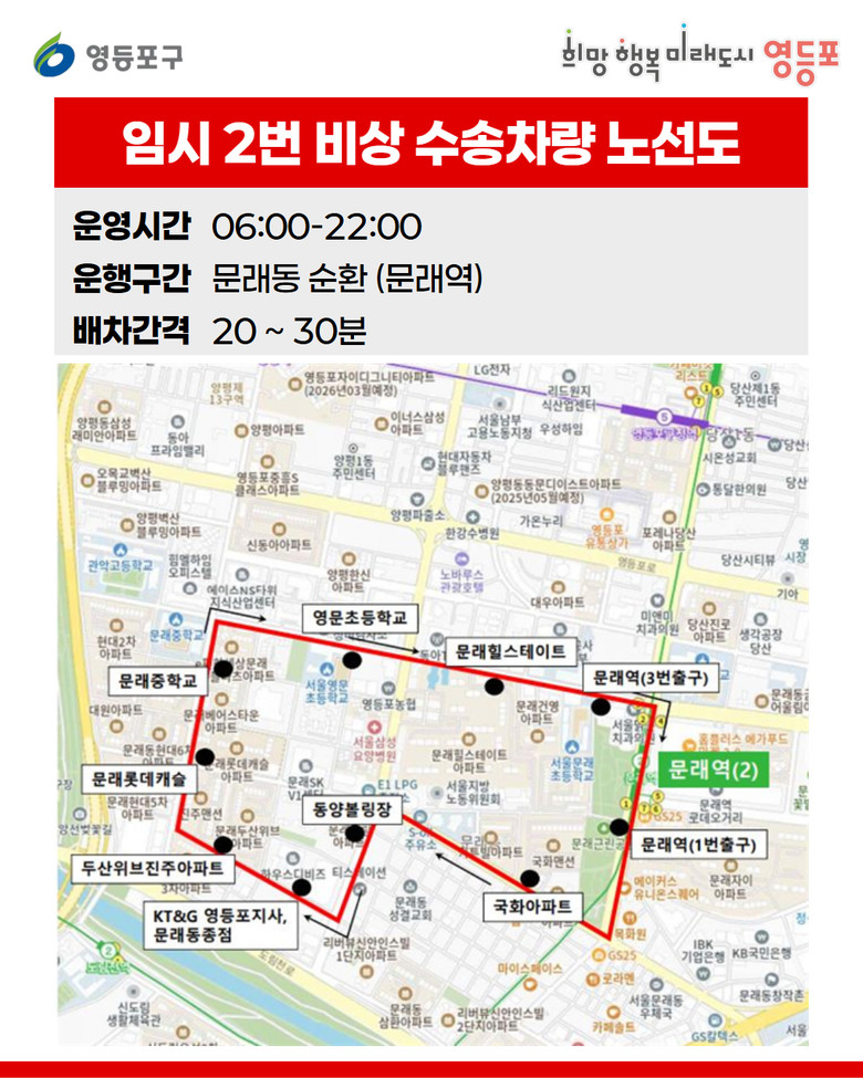 임시 운행 노선은 ▲1번 노선, 선유도역~당산역~영등포시장역~영등포역 ▲2번 노선, 문래역~국화아파트~문래중학교(문래동 순환) ▲3번 노선, 보라매역~공군호텔~샛강역~여의도역이다. 노선별 각 2~3대의 차량이 배치돼 순환 운행될 예정이다. 각 셔틀버스에는 구청 직원이 탑승해 구민의 안전한 승‧하차를 지원하고, 운행 노선과 정류장 안내를 맡는다.