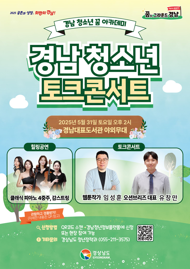 윤인국 경남도 교육청년국장은 “이번 토크콘서트는 도민들이 지역에서 꿈을 이뤄가는 청년들의 이야기를 더 쉽게 접할 수 있도록 마련된 자리”라며 “더욱 많은 경남 청년과 청소년이 꿈을 키워갈 수 있도록 다양한 프로그램을 지속적으로 운영하겠다”고 말했다.