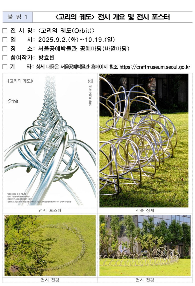 먼저 9월 2일(화)부터 10월 19일(금)까지 박물관 바깥마당에서 방효빈 작가의 대형 설치작품 <고리의 궤도>를 선보인다. 19cm의 작은 고리에서 출발해 480개의 스테인리스 고리가 연결·확장되며 거대한 궤도를 형성하는 작품으로, 인간관계 속 긴장과 조화를 시각화했다. 관람객이 작품에 직접 앉고 가까이 체험할 수 있도록 설계된 점이 눈길을 끈다.