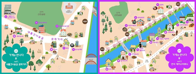 | ▲ 상권을 한눈에 볼 수 있는 일러스트 지도 내를건너숲길 문화길(왼쪽), 연서 테이스티로드(오른쪽) |