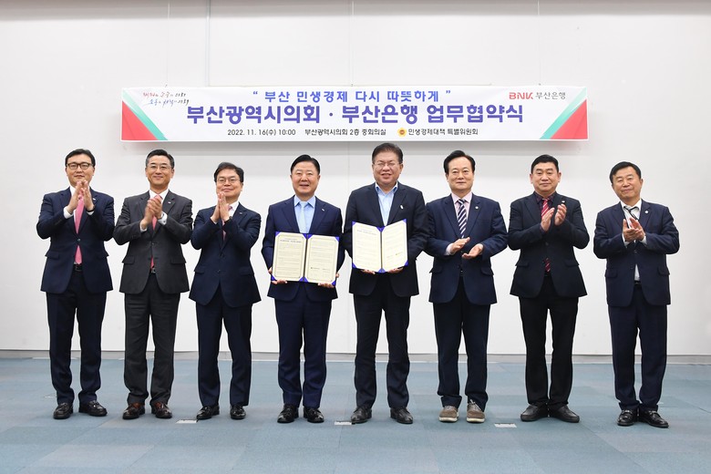 이번 협약은 부산시의회와 BNK부산은행이 3高(高금리⋅高물가⋅高환율) 및 코로나19 장기화에 따른 이중고를 겪고 있는 지역 영세 소상공인, 취약계층 등에 대한 위기 극복 지원을 위한 것으로