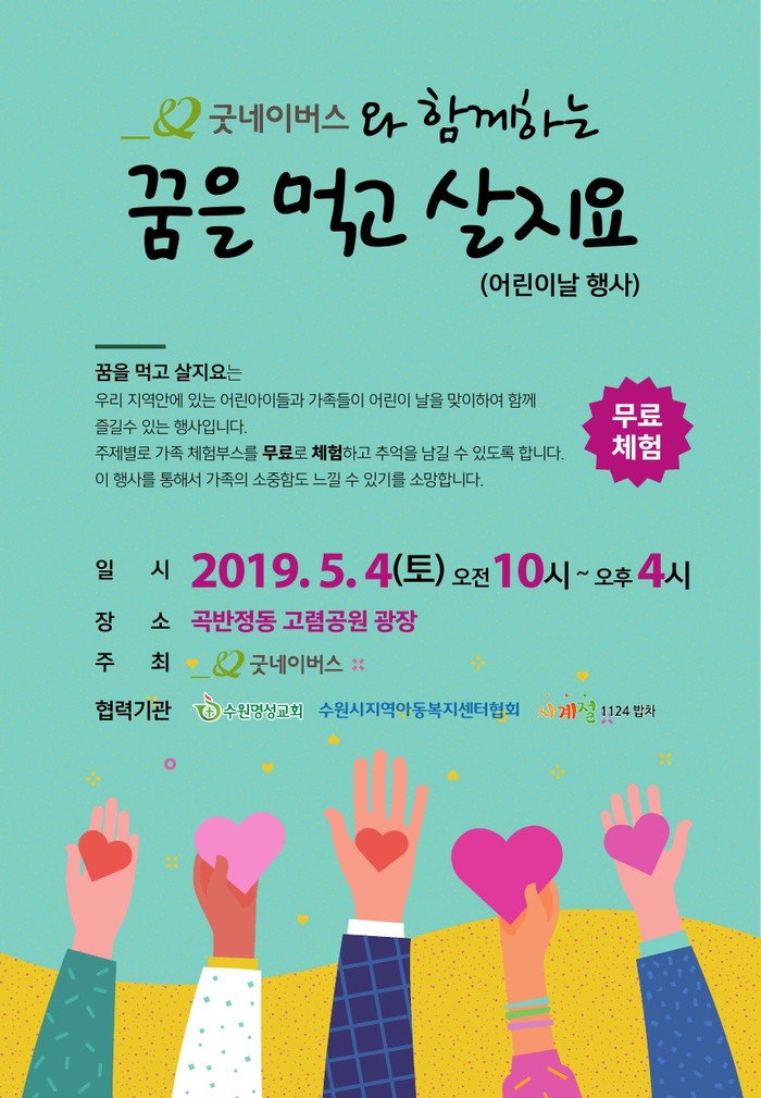 [세계타임즈 이영진 기자] 어린이 날을 맞이하여 국제구호개발 NGO 굿네이버스 경기1본부(본부장 양재명)와 수원명성교회(담임목사 유만석)가 함께 제1회 ‘꿈을 먹고 살지요’ 어린이 축제를 5월 4일(토) 10시부터 16시까지, 수원시 곡반정동 고렴공원 광장에서 진행한다.