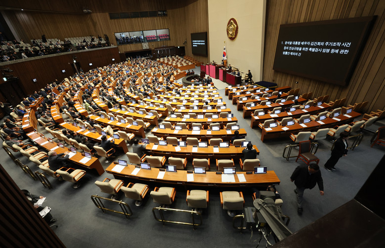 7일 오후 국회 본회의에서 재의결 안건인 김건희 여사 특검법 표결 뒤 다수의 국민의힘 의원들이 퇴장해 자리가 비어 있다. 2024.12.7