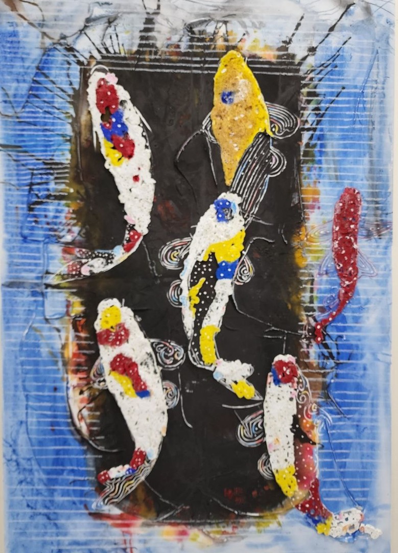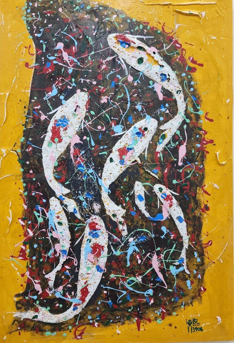 빠르고 섹시하고 매끈했다. 살아있는 물고기가 탐나서 두 손으로 부여잡으면 미끄덩하니 쑥하고 빠져나갈 듯하다. 알록달록 원색의 비단잉어가 빛으로 눈이 부시다. 무색(無色)으로 보이는 찰나를 순간포착한 듯하다. 주인공인 물고기가 순백인데도 화려함의 극치다. 물고기 위의 방점인 빛의 삼원색은 한국의 양반집 색동저고리 같다. 잉어의 자태가 경솔하지도 둔하지도 않다. 화폭 안의 물고기들이 코끝으로 물을 가르는 듯하다. 지느러미와 허리를 비틀며 속도를 내는 몸놀림이 유연한데 힘이 넘친다. 분명 멈춘 그림인데 움직이는 영상을 보는것 같다. 여러 마리가 함께 조화를 이룬다. 한 곳에 머물러 있는게 아니라 일사불란하고 목표와 방향성이 있다. 그림의 시선은 잉어를 수면 위에서 가깝게 바라본 것이다. 바탕이 강렬한 색채로 거칠게 그려졌음에도 절제와 원숙미가 느껴졌다. 작품을 보기만 했는데도 기운이 난다.
