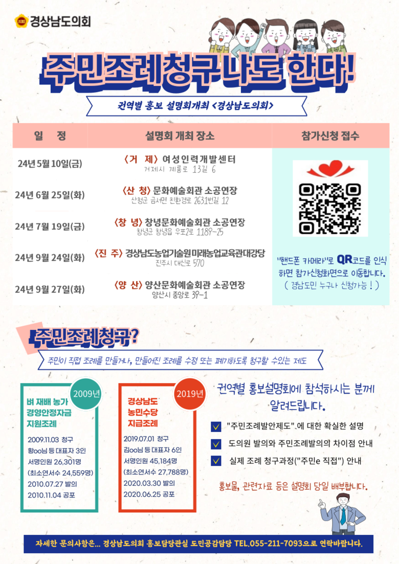 이번 설명회는 주민조례발안제도의 필요성 등 제도소개와 청구절차, 주민의 지방자치 참여에 대한 특강으로 구성되며, 경상남도의 사례 외에도, 시‧군별 청구사례와 외국의 주민조례발안제도 등도 함께 소개할 계획이다. 또한 본 행사의 참석대상은 지방자치와 주민조례발안제도에 관심이 있는 도민이면 누구나 참석할 수 있다.