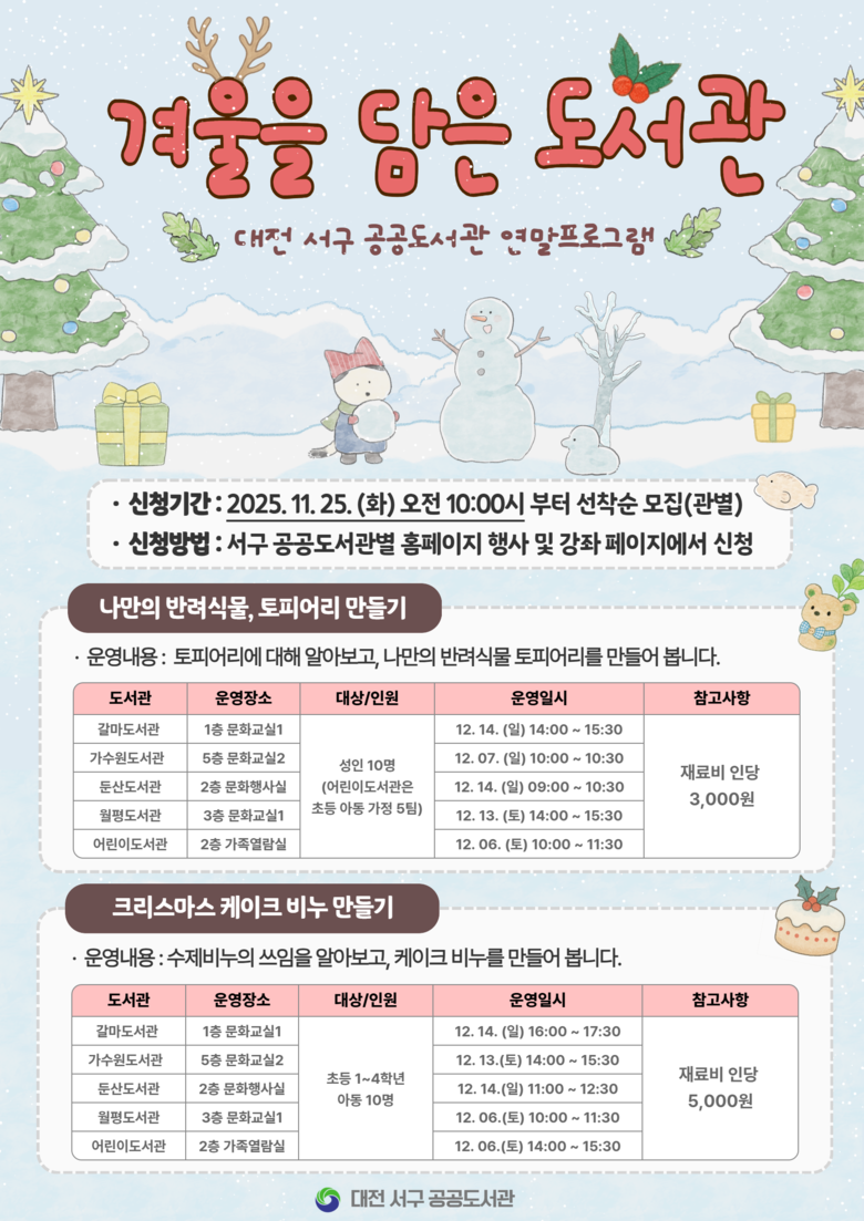 참가 신청은 11월 25일(화) 오전 10시부터 각 도서관 홈페이지를 통해 선착순 접수로 진행된다. 세부 일정과 문의는 갈마(☎042-288-4745), 가수원(042-288-4775), 둔산(042-288-4808), 월평(042-288-4872), 어린이도서관(042-288-4833)을 통해 안내받을 수 있다.
