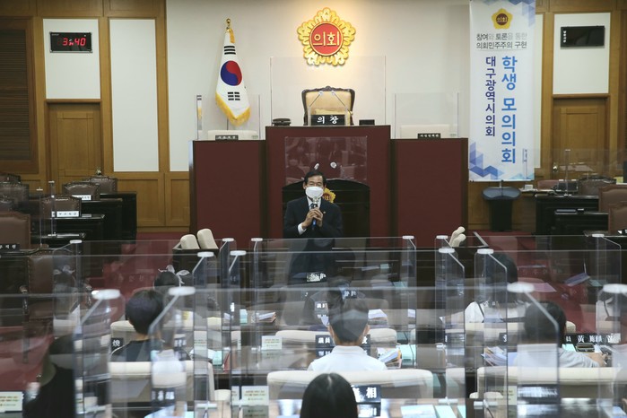 장상수 의장은 “모의의회 참여를 계기로 참가 학생들이 지방자치와 시의회에 대한 관심을 갖고, 우리 삶에서 시의회가 하는 역할을 이해하는 시간이 되었기를 바란다”라며, “대화와 토론을 통해 민주적인 의사결정 과정을 몸에 익히고, 건강한 선진시민으로 우리 사회와 대구의 발전을 위해 훌륭한 인물로 성장해주기를 바란다”라고 말했다.