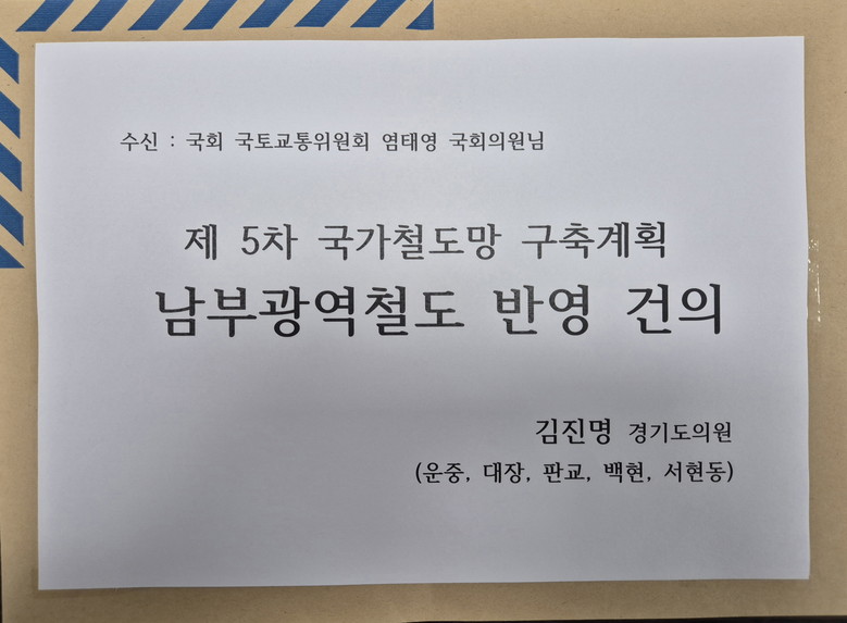 김진명 의원은 “남부광역철도는 더 이상 선택이 아닌 필수”라며 “제5차 국가철도망 구축계획에 반드시 반영돼야 한다”고 재차 촉구했다.