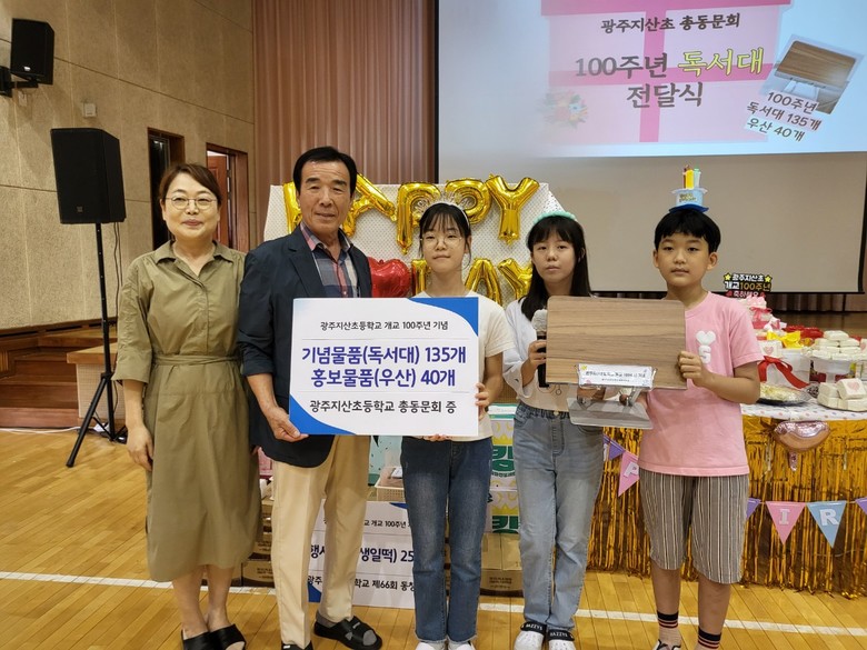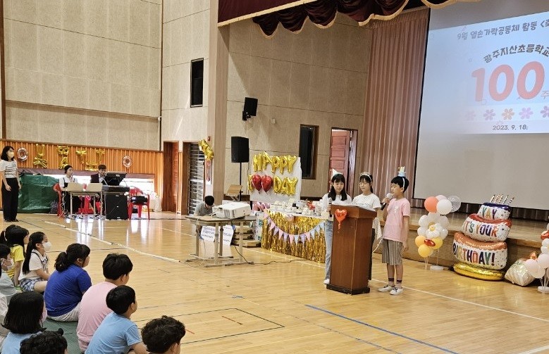 광주지산초에 따르면 이날 행사에서는 전교생과 교직원들이 강당에 모여 학교의 100번째 생일을 축하하며 떡을 나누고, 학교의 발자취를 돌아보는 시간을 가졌다.