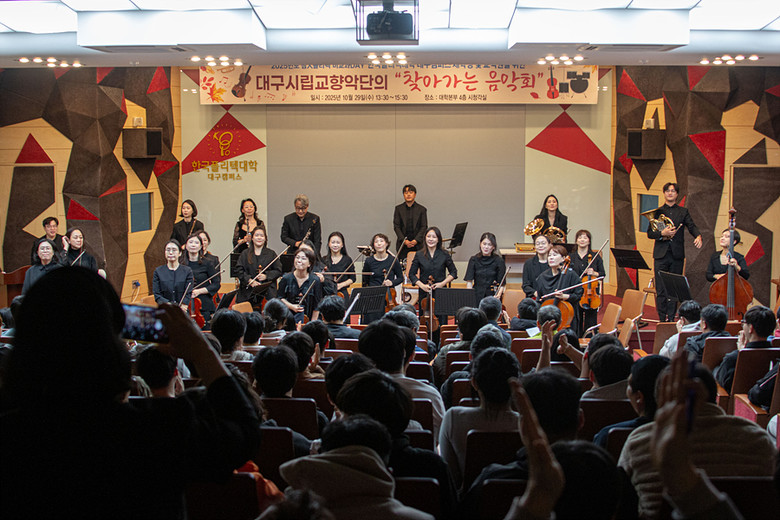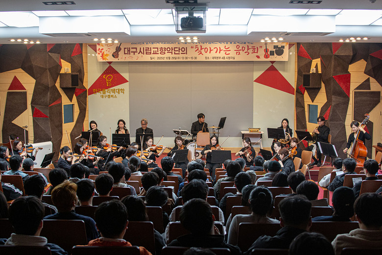 ▸ 한국폴리텍대학 학생 예술 향유 및 융합형 인재양성 위한 상생 협력의 첫걸음 [세계타임즈=대구 한윤석 기자] 대구문화예술진흥원(이하 ‘진흥원’) 산하 대구시립교향악단(음악감독 겸 상임지휘자 백진현)이 10월 29일(수) 한국폴리텍대학 대구캠퍼스(학장직무대행 노진호, 이하 ‘폴리텍대학’) 본부 4층 시청각실에서 올해 마지막 ‘찾아가는 음악회’를 성료했다.