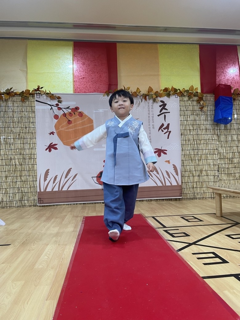 4세는 우리나라 전통 의복인 한복의 멋을 느끼고 아름다움을 뽐내볼 수 있는 한복 패션쇼와 함께 비석치기, 사방치기, 투호놀이, 팽이치기, 공기놀이 등 여러 가지 전래놀이를 체험하고 엉덩이 씨름 왕중왕전을 개최하여 엉덩이 씨름왕을 선발하며 한가위 신명나는 ‘전통놀이 한마당’을 즐겼다. 5세는 전통 예절 교육을 통해 올바른 인사법과 절하는 방법을 배워보고, 전통 다기를 활용한 다도 예절과 다식 만들기를 하며 ‘우리나라 전통 예절’을 체험해 보는 시간을 가졌다.