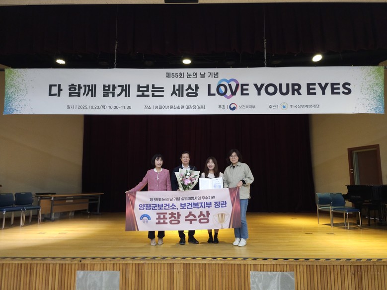 ‘제55회 세계 눈의 날 기념식’은 세계보건기구(WHO)가 지정한 눈의 날(10월 둘째 주 목요일)을 기념한 행사로, 양평군보건소는 실명예방사업에 적극 참여하며 지역 주민의 눈 건강 증진에 기여한 공로를 인정받았다.