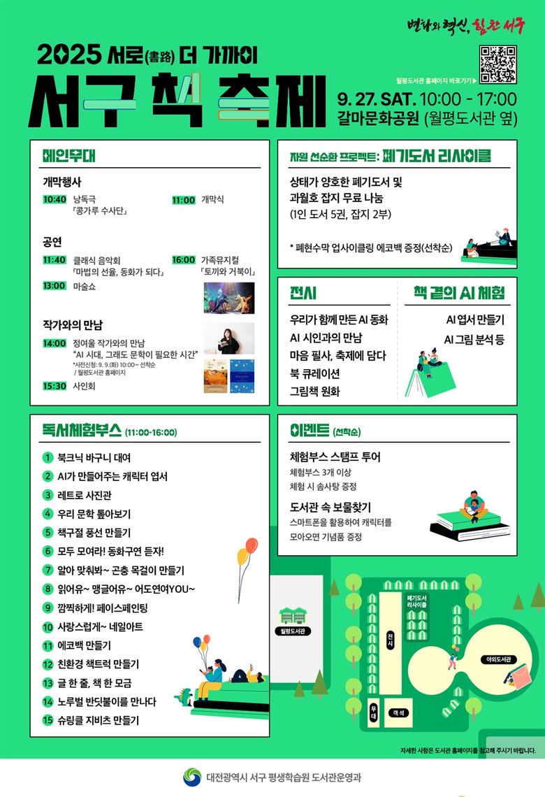 특히, 상태가 양호한 도서를 선별하여 주민에게 무료로 제공하는 자원 선순환 프로젝트 ‘폐기 도서 리사이클’이 올해부터 새로 운영된다. 이와 함께 스탬프 투어, 북 큐레이션, AI 시인과의 만남, 그림책 원화 전시 등 풍성한 부대행사도 마련됐다.