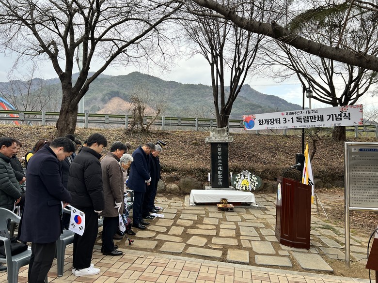 [하동군 세계타임즈=최성룡 기자] 하동군 화개면은 제106주년 삼일절을 기념해 화개장터 3.1절 기념비 일원에서 ‘화개장터3.1 독립만세 기념식’을 거행했다고 밝혔다.