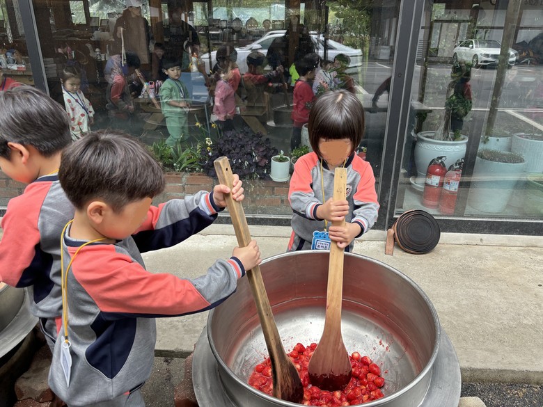 이번 체험활동은 ▲딸기 수확하기 ▲딸기 맛보기 ▲딸기잼 만들기 순으로 이어졌다. 유아들은 딸기를 직접 따보는 경험을 통해 딸기를 관찰하면서“선생님! 딸기가 꼭 초록색 모자를 쓴 것 같아요!”라고 말하며 자연에 대한 관심과 애정이 높아졌다. 또한 유아들은 커다란 솥에 큰 주걱으로 함께 힘을 모아 딸기를 으깨어 잼을 만드는 과정에서 공동체의 즐거움을 경험할 수 있었다. 자신들이 만든 딸기잼은 빵에 발라 나눠 먹는 과정에서 유아들은 마치 자신이 요리사가 된 것처럼 뿌듯해하였다.