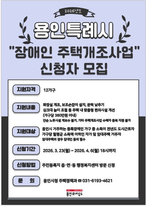 신청 대상은 용인에 거주하고 있는 등록장애인 중 소득액이 전년도 도시 근로자 가구당 월평균 소득액 이하로 자가나 임대주택에 거주해야 한다. 올해 도시근로자 가구당 월 평균 소득액 기준은 ▲1인가구(381만 3363원) ▲2인가구(586만 6270원) ▲3인가구(816만 8429원) ▲4인가구(880만 2202원) ▲5인가구(932만 6985원)이다.
