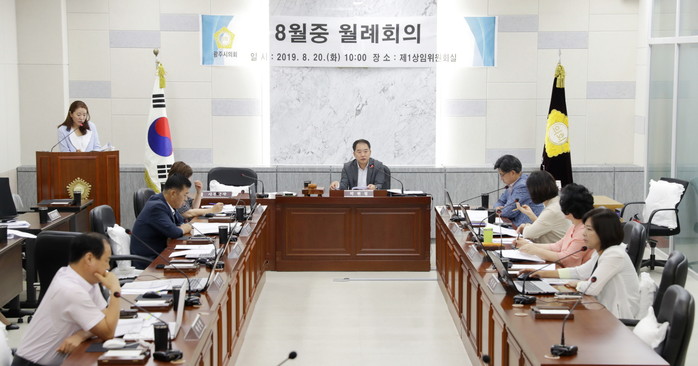 [광주=세계타임즈 손권일 기자] 광주시의회(의장 박현철)는 지난 20일, 제1상임위원회실에서 8월중 의회 월례회의를 개최했다. 이번 회의에서는 광주시의회 성희롱.성폭력예방지침 제정에 대한 보고와 8월중 칭찬공무원 추천안내 공지를 받았다.
