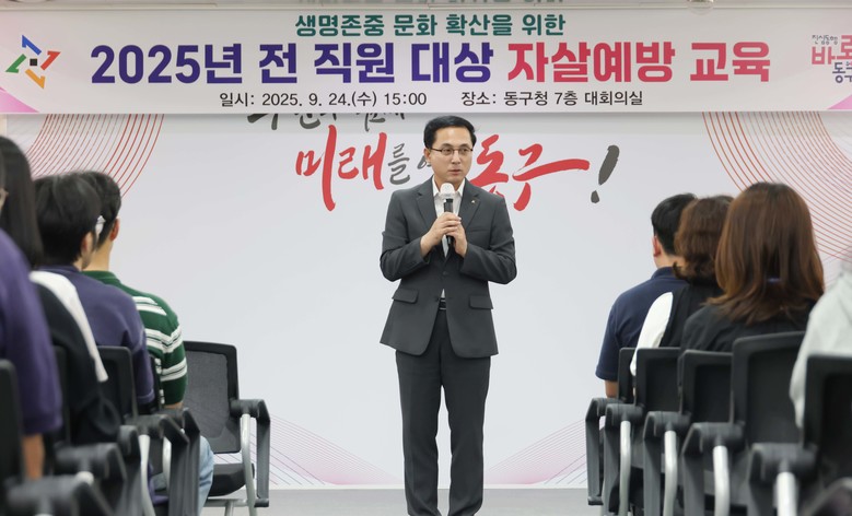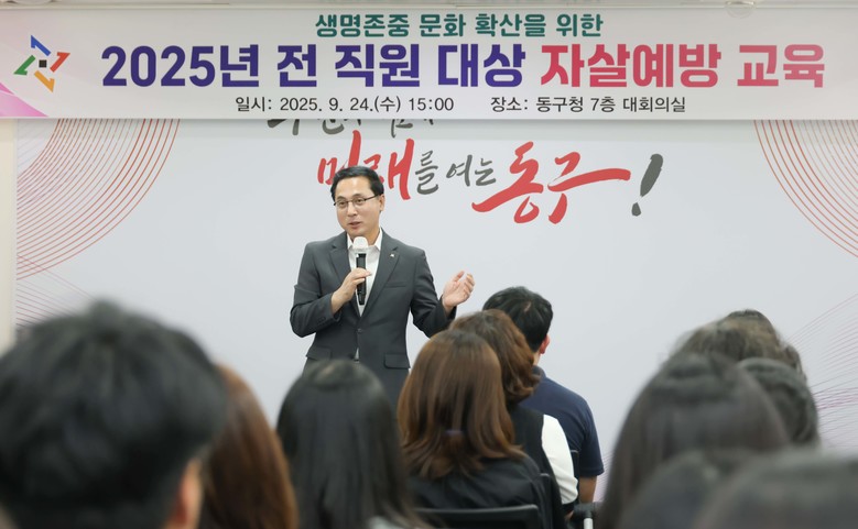 박희조 동구청장은 “이번 교육을 통해 직원들이 생명의 소중함을 다시금 되새기고, 주변에서 위험 신호를 보이는 동료나 주민을 지켜낼 수 있는 ‘생명지킴이’로 성장하기를 기대한다”며 “앞으로도 지속적인 자살예방 교육과 정신건강 증진 활동을 통해 건강하고 안전한 조직문화를 만들어 가겠다”고 말했다.