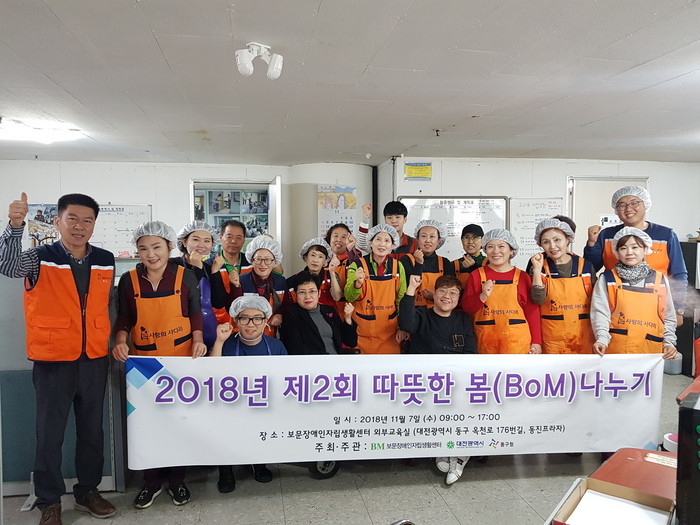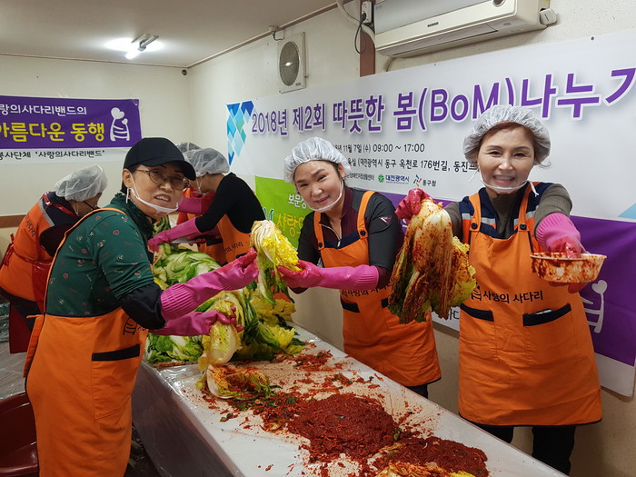 [세계타임즈 이장성 기자] 7천명 SNS 대전시 봉사단체 사랑의 사다리 밴드(리더 이정제)는 7일 오전9시, 동구 판암동에 위치한 보문장애인자립생활센터(센터장 신인수)에서 김장 300포기 봉사로 우리 사회의 따뜻한 사랑을 실천하였다.