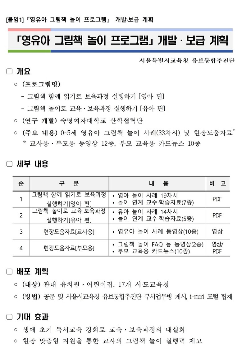 이번 프로그램은 서울시교육청이 0~2세 영아를 위해 그림책 놀이 프로그램을 직접 개발하여 보급하는 첫 사례다. 유치원과 어린이집 어디에서나 질 높은 독서 교육이 안정적으로 이루어질 수 있도록 지원함으로써, 영유아 생애 초기 독서교육을 강화하고 기관 간 교육 격차 완화에 기여할 것으로 기대된다.