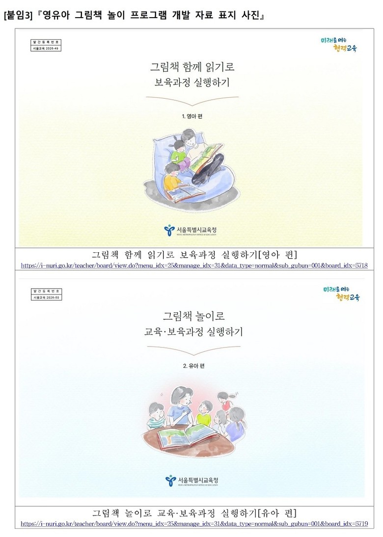 서울시교육청은 이번 프로그램 보급의 실질적인 현장 안착을 위해 0~2세 영아용 책놀이 꾸러미(그림책 5종, 교수·학습자료 7종)를 관내 어린이집 100개 기관에 시범 보급하였으며, 2026년에 약 2,000여 개 기관으로 확대 보급하여 보육과정의 내실 있는 운영을 지원한다.