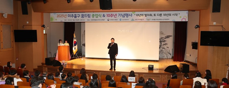 [미추홀구 세계타임즈=심하린 기자] 인천 미추홀구학교밖청소년지원센터(센터장 최문주, 이하 센터)는 지난 27일 ‘2025년 종업식 및 개소 10주년 기념행사’를 열고 청소년과 관계 기관 관계자 등 130여 명이 참석한 가운데 센터의 지난 10년을 돌아보는 시간을 가졌다.