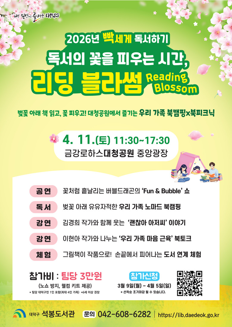 이번 행사는 ‘독서의 꽃을 피우는 시간, 리딩 블라썸(Reading Blossom)’이라는 주제로 대청공원 잔디밭에서 가족이 함께 책을 읽으며 소통하는 북피크닉 형태로 진행된다.