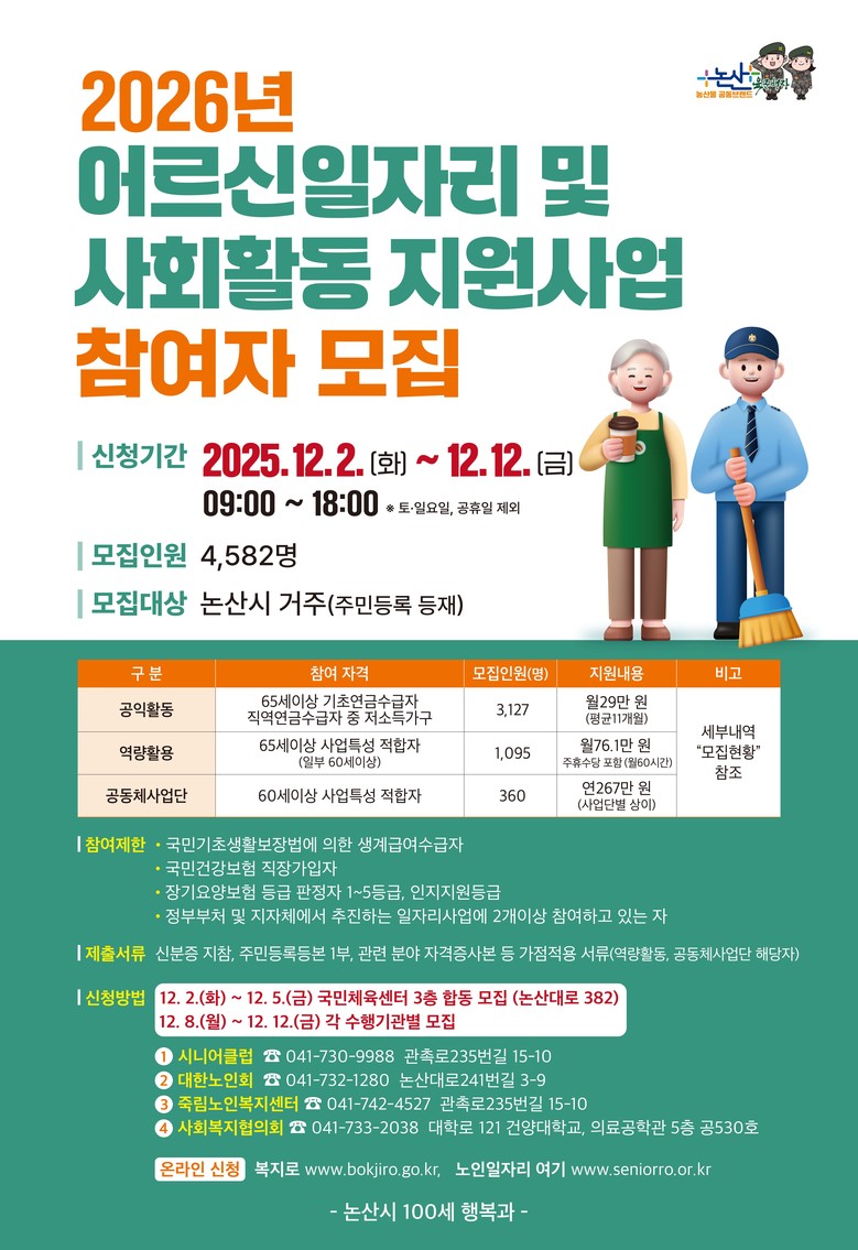 2026년 모집 인원은 올해보다 304명 늘어난 4,582명으로 △지역사회 환경개선사업 등 공익형 3,127명 △보육시설 지원 등 역량활용형 1,095명 △공동체사업단 360명으로 구성된다.