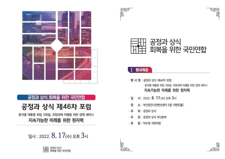 공정과 상식 회복을 위한 국민연합(상임대표 정용상)은 17일 부산항 국제여객터미널 5층 부산항전시컨벤션센터(이벤트홀C)에서 ‘윤석열 대통령 취임 100일, 국정과제 이행을 위한 정책세미나 - 지속가능한 미래를 위한 원자력’ 포럼행사를 개최했다.