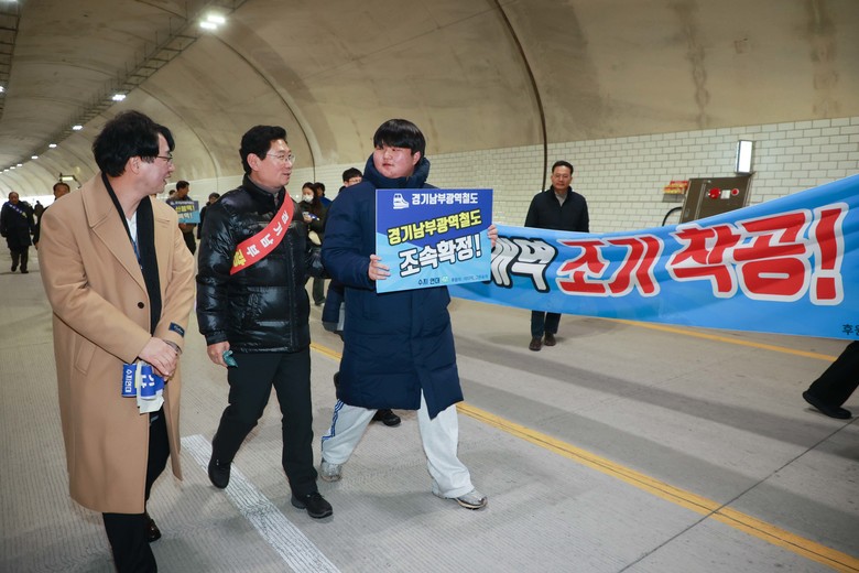 이 시장은 "경기남부광역철도를 함께 의논하고 추진하자고 했던 김동연 경기도지사가 지난해 이 사업을 경기도 광역철도 우선순위 1~3위 아래로 내려놓아서 제가 지난해 11월부터 올해 2월까지 여러 번에 걸쳐 김지사를 비판한 바 있다"며 "4개 도시 시장들이 공동으로 추진하고 있고, 수지구 시민들이 간절한 마음으로 이렇게 응원해 주시는 만큼 반드시 성사될 것이란 믿음을 갖고 열심히 일하겠다"고 말했다.
