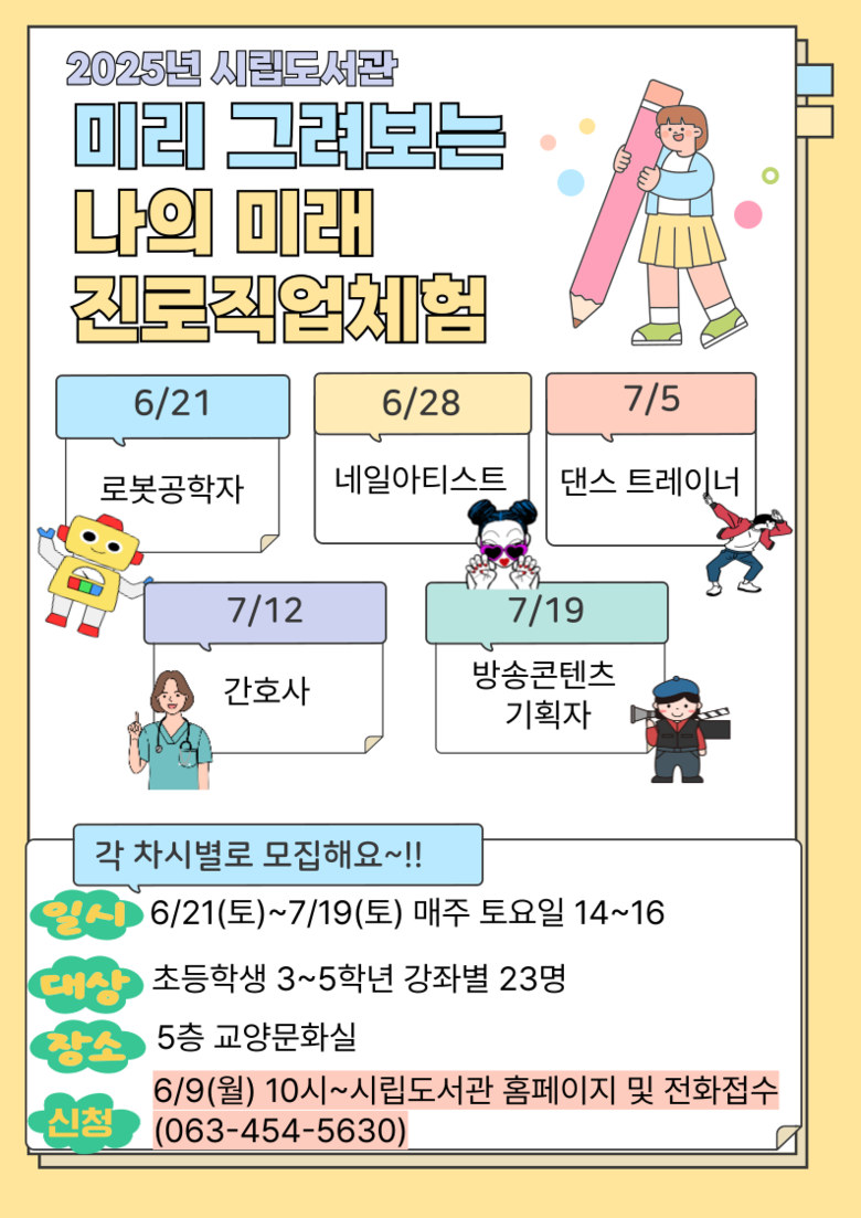도서관은 방송콘텐츠 기획자·네일 아티스트·댄스 트레이너·간호사·로봇 공학자 등 요즘 어린이들 흥미로워하는 5가지 직업인의 특강과 체험행사로 진행할 예정이다.