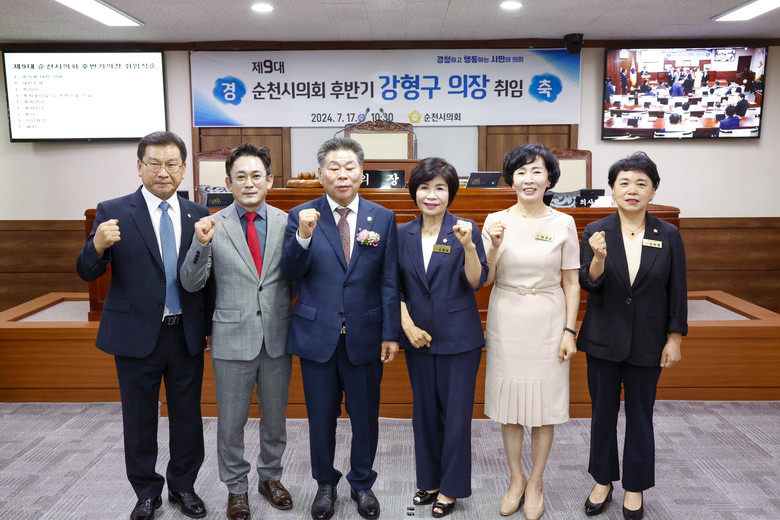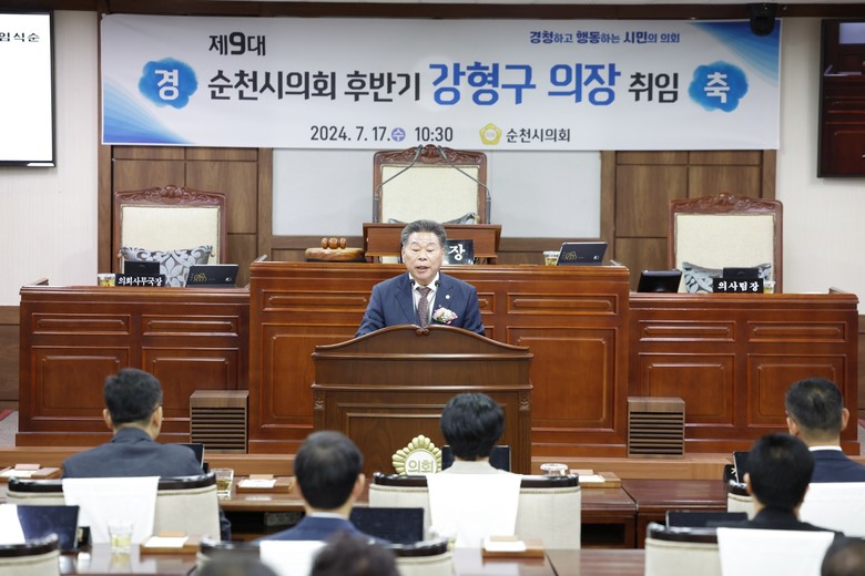 [순천시 세계타임즈=우덕현 기자] 순천시의회(의장 강형구)는 17일 본회의장에서 지난 1일 선출된 제9대 후반기 강형구 의장의 취임식을 가졌다.