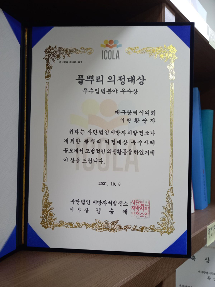 황순자 의원은 지난 2019년 9월 「대구광역시 수소산업육성 및 지원에 관한 조례」를 제정하여 수소 산업이라는 부가가치가 큰 신산업을 체계적으로 육성하기 위한 기틀을 마련하는 등 활발한 입법 활동으로 지역 발전에 기여한 공로를 인정받았다.