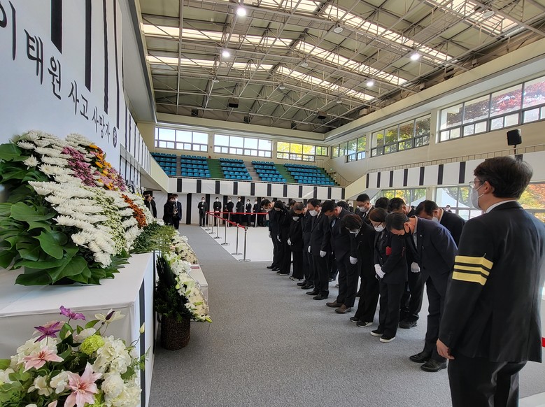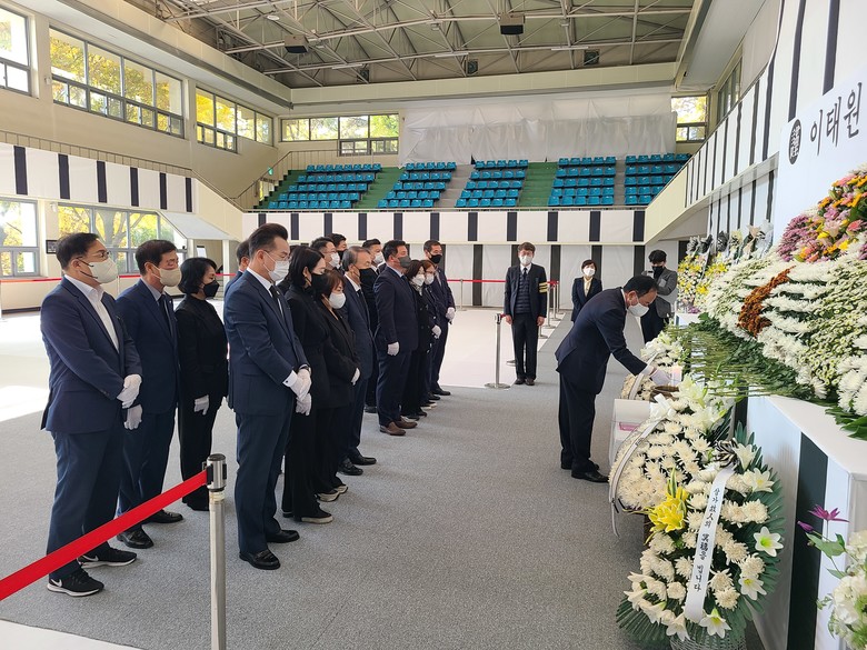 [대구 세계타임즈=한성국 기자] 대구광역시의회 이만규 의장을 비롯한 시의원들은 11월 1일(화) 오전 10시 30분, 안병근올림픽기념유도관에 마련된 이태원 사고 사망자 합동분향소에서 헌화와 묵념을 하면서 희생자들을 애도했다.