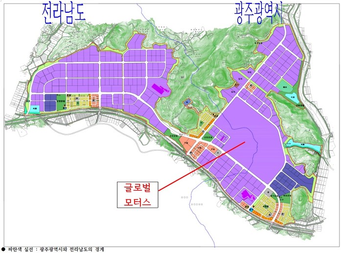 빛그린 산업단지는 총면적 407만 1천㎡ 부지에 광주광역시 184만 7천㎡(전체면적의 45%)이고 전라남도 222만 4천㎡(55%)에 조성할 예정으로 이 단지내에 설립될 글로벌모터스는 광주광역시 부지 41만㎡(67.9%), 전라남도 부지 19만 4천㎡(22,1%)를 차지하게 될 예정이다.