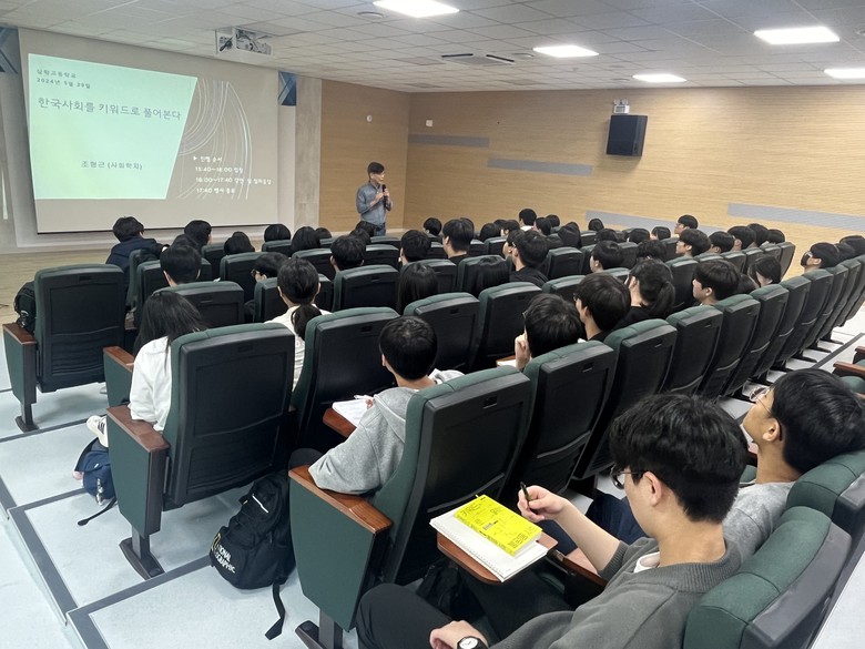 [파주시 세계타임즈=송민수 기자] 파주 심학고등학교(교장 김현제)는 5월 29일 사회학자 조형근 박사를 강사로 모시고‘한국 사회를 키워드로 풀어본다’라는 주제로 우리 사회의 다양한 문제의 원인과 해결 방안에 대해 함께 생각해 보는 기회를 가졌다.