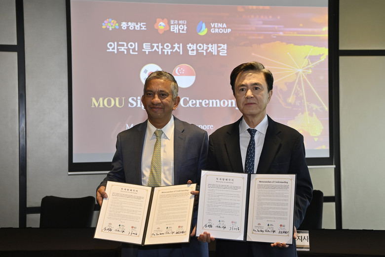 김 지사는 지난 6일 싱가포르 스위소텔 더 스탬포드 호텔에서 니틴 압테 뷔나그룹 대표, 정광진 뷔나그룹 한국 대표, 가세로 태안군수와 투자 양해각서(MOU)를 체결했다.