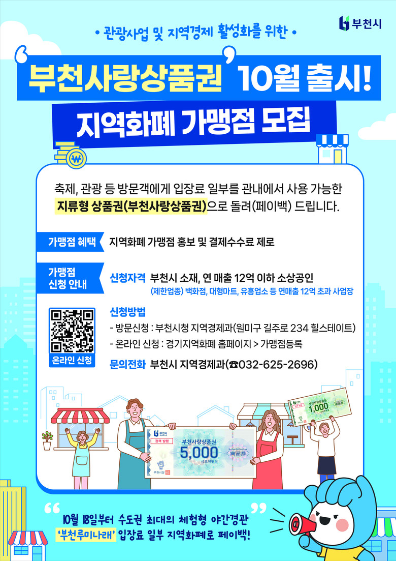 첫 발행은 10월 개장을 앞둔 야간 체험명소‘부천 루미나래’에서 진행된다. 입장권 구매자에게는 일부 금액을 지류형 상품권으로 환급해주며, 해당 상품권은 전통시장, 골목상점가 부천시 내 지류형가맹점에서 사용할 수 있다